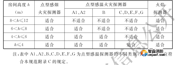 5.2.1 对不同高度的房间,可按表5.2.1选择点型火灾探测器。