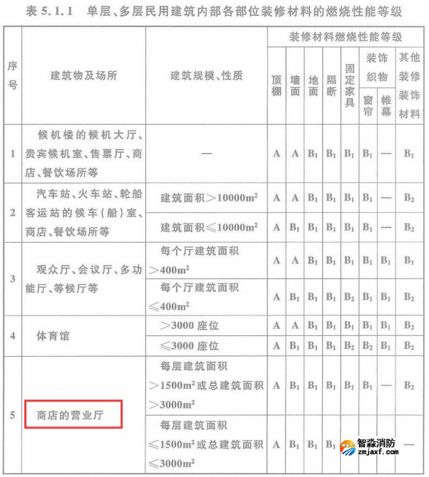 附《建筑内部装修设计防火规范》GB 50222-2017有关商店建筑装修材料燃烧性能标准要求: