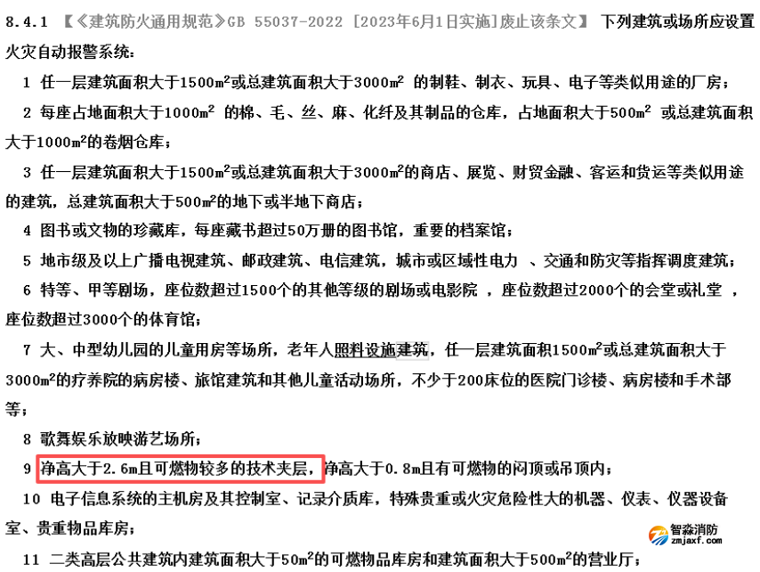 根据《建筑防火通用规范》GB 55037-2022在条文说明,也可以看出:如果遇到技术夹层,是这两条未规定的其他建筑或场所,可以按照国家现行相关标准的要求或建筑的火灾危险性等实际情况确定。此时就可以参照GB50016-2014(2018年版)的8.4.1条的9款来执行。